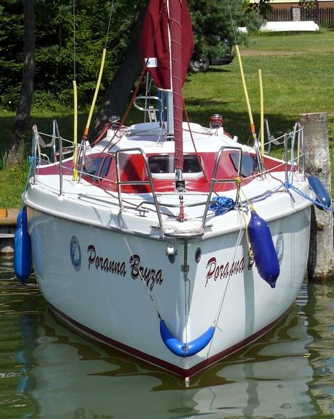 Wysokiej jakości wyposażenie: kabestany, stopery, rolfok. Zastosowana przekładnia umożliwia łatwe podnoszenie i opuszczanie uchylnego miecza. Dzięki zastosowanemu patentowi stawianie i kładzenie masztu jest łatwe. Wszystkie liny obsługiwane są z kokpitu. Niewielkie zanurzenie umożliwia cumowanie bezpośrednio przy brzegu. Duża ilość żagla sprawia, że jacht jest bardzo szybki. W kambuzie jachtu znajdziecie dwupalnikową kuchenkę gazową oraz zlew z bieżącą wodą. Komplet naczyń, sztućców, garnków, cedzak oraz patelnia uzupełniają wyposażenie kuchni. Składany stolik wewnątrz jachtu oraz dodatkowy w kokpicie umożliwia wygodne spożywanie posiłków. Duża ilość bakist oraz jaskółek ułatwia przechowywanie bagażu. W jachcie wydzielono WC z toaletą chemiczną. Instalacje elektryczna 12V i 230V z możliwością ładowania akumulatorów. Jacht posiada przetowrnicę 230V oraz gniazdo 12V.