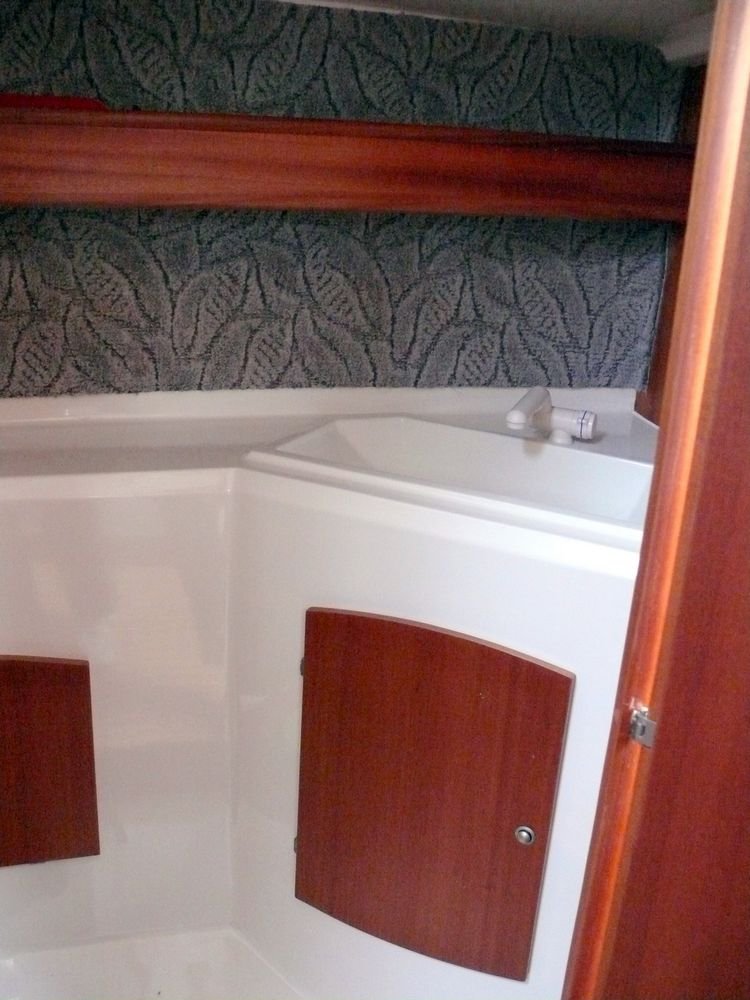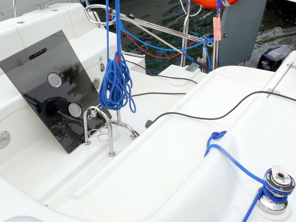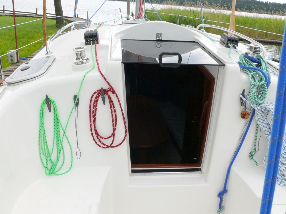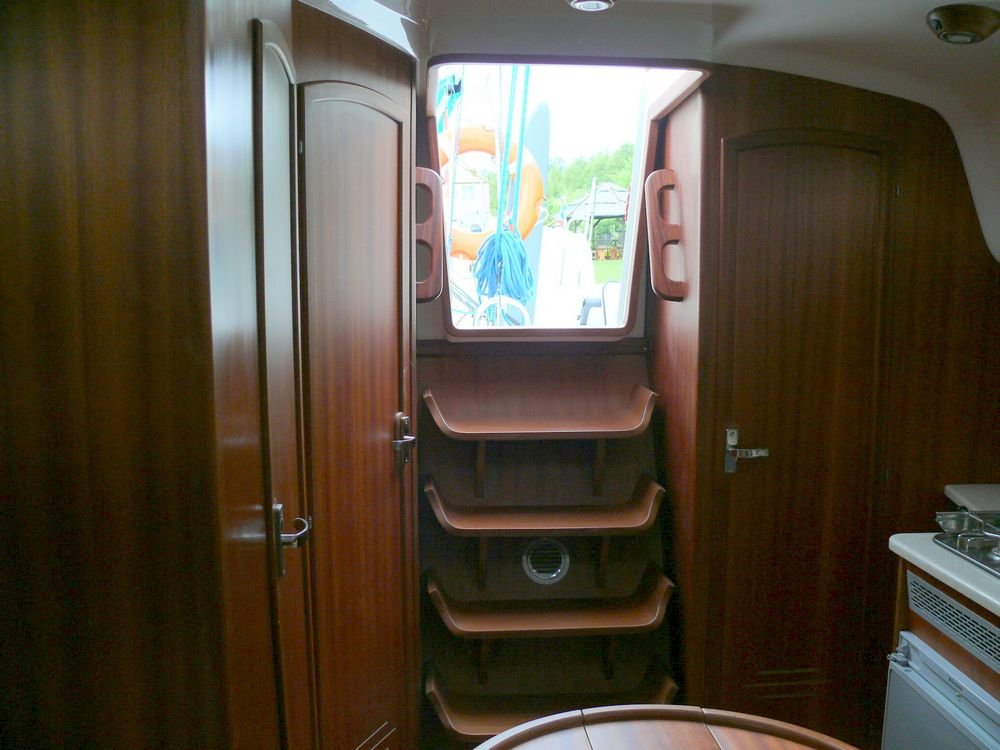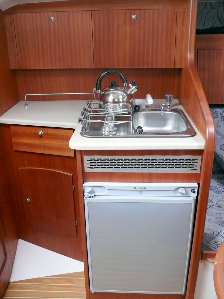 Łatwy w prowadzeniu, bezpieczny, wyposażony w telewizor z DVD (DVB-T), ster strumeniowy, Lazy Jack, Rolfok i oczywiście patent do kładzenia masztu. Kambuz wyposażony w lodówkę, umywalkę, dwupalnikową kuchenkę, ujęcie pitnej i zaburtowej wody zasilanej pompą ciśnieniową, dodatkowo radio, stolik w kokpicie, WC chemiczne, oraz bezpieczne ogrzewanie.