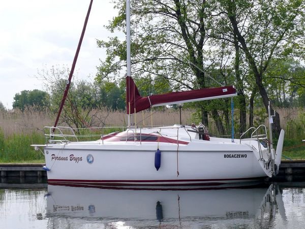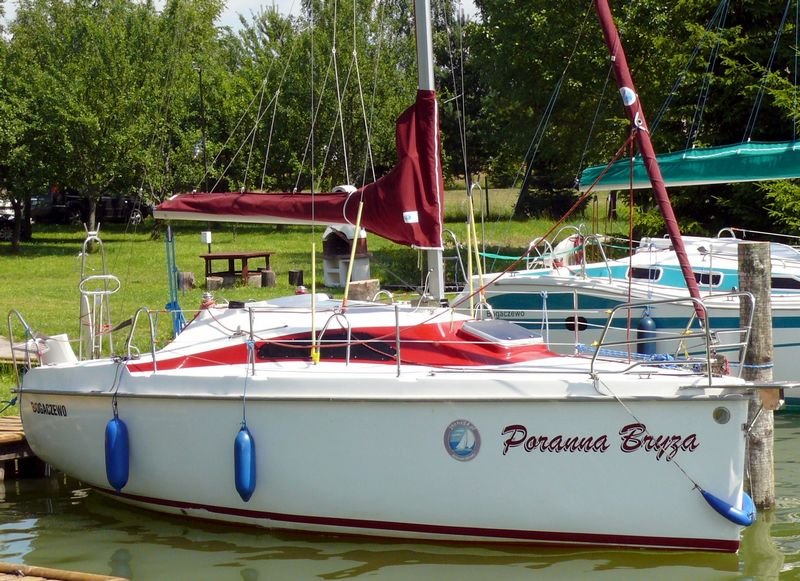 Wysokiej jakości wyposażenie: kabestany, stopery, rolfok. Zastosowana przekładnia umożliwia łatwe podnoszenie i opuszczanie uchylnego miecza. Dzięki zastosowanemu patentowi stawianie i kładzenie masztu jest łatwe. Wszystkie liny obsługiwane są z kokpitu. Niewielkie zanurzenie umożliwia cumowanie bezpośrednio przy brzegu. Duża ilość żagla sprawia, że jacht jest bardzo szybki. W kambuzie jachtu znajdziecie dwupalnikową kuchenkę gazową oraz zlew z bieżącą wodą. Komplet naczyń, sztućców, garnków, cedzak oraz patelnia uzupełniają wyposażenie kuchni. Składany stolik wewnątrz jachtu oraz dodatkowy w kokpicie umożliwia wygodne spożywanie posiłków. Duża ilość bakist oraz jaskółek ułatwia przechowywanie bagażu. W jachcie wydzielono WC z toaletą chemiczną. Instalacje elektryczna 12V i 230V z możliwością ładowania akumulatorów. Jacht posiada przetowrnicę 230V oraz gniazdo 12V.