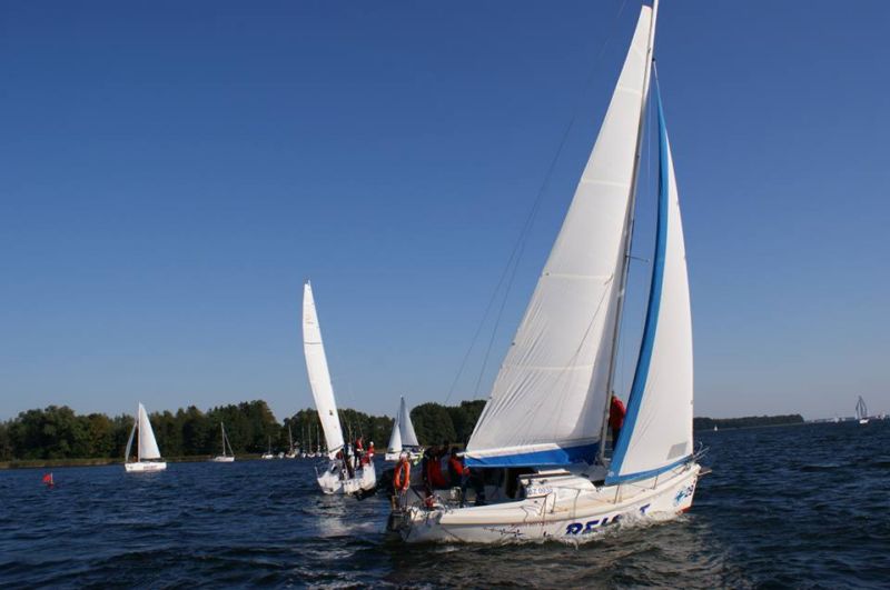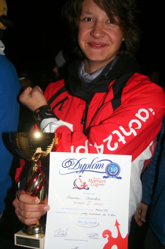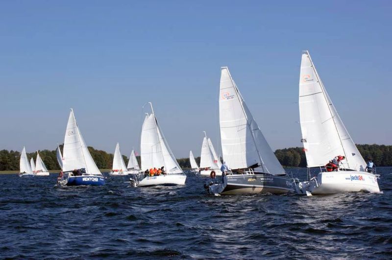 Przed rokiem po ciekawej walce i ataku z 5 miejsca, wygraliśmy! Tym razem startowaliśmy świeżo po zwycięstwie w NorthmanCup, na Maxusie 26 w klasie do 7.99m, która, jak stwierdził jeden ze znawców, idealne do niego pasuje. Jak co roku konkurencja silna a załogi z dużym doświadczeniem i ambicjami wygrania tych, dla wielu, prestiżowych regat. W naszej klasie starowało 45 jachtów i była to najliczniejsza klasa. Ścisk i silny wiatr na linii startu  nie sprzyjają bezpieczeństwu, a wystartować trzeba dobrze, bo potem szans na odrabianie nie będzie. Wybieramy prawą stronę, bo większość jachtów jest z lewej, to jednak ma pewne plusy, tu jest Pani Kasia i robi nam zdjęcie – niestety tylko jedno! Początek wyścigu mamy nerwowy, ale ostatecznie zaczynamy robić swoje: nabieramy prędkości i płyniemy we właściwą stronę. Jesteśmy z przodu! Małe porównanie do rywali wypada dobrze i możemy dalej spokojnie żeglować. Wypływamy na Mamry, przed nami dwie grupy jachtów startujących wcześniej, na szczęście nie przeszkadzają za bardzo i na dolnej boi meldujemy się pierwsi. Kurs z wiatrem mamy opanowany i przyjacielski, nasz dobry znajomy konsekwentnie zabiera nam wiatr, a my, nie uciekamy, zawsze w grupie raźniej! Druga część kursu pełnego wychodzi nam lepiej i mamy mały zapas .