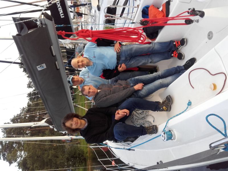 Starujemy w trzeciej najliczniejszej grupie Maxusy 24 EVO i Maxusy 26 łącznie 40 jachtów. Linia startu dość długa ale i tak gęsto. Odliczanie nas zawodzi i trafiamy na linię startu ze sporą stratą, do tego konieczne dwa dodatkowe zwroty i … jesteśmy trzeci na górnej boji! Pierwsza 24 evo potem dwie 26. Przed nami dwóch bardzo dobrych żeglarzy za nami kolejny, jesteśmy w doborowym towarzystwie. Oni nas nie znają, bo pierwszy raz mamy okazję rywalizować, ale jak się utrzymamy w tej grupie to zaliczymy dobry występ . Na pełnym próbujemy ataku, ale przeciwnicy płyną bardzo dobrze, my gorzej. Na drugim pełnym kursie wychodzimy na prowadzenie, a dodatkowo zaczynamy łykanie Maksusów 28 i 33.